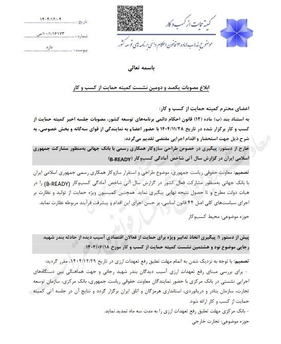در این نشست و خارج از دستور، موضوع طراحی و استقرار سازوکار همکاری رسمی جمهوری اسلامی ایران با بانک جهانی به منظور مشارکت فعال کشور در گزارش سال آتی شاخص آمادگی کسبوکار (B-READY) بررسی شد. بر این اساس مقرر شد معاونت حقوقی ریاست جمهوری این موضوع را در هیأت دولت مطرح و تا حصول نتیجه نهایی پیگیری کند. همچنین کمیسیون ویژه حمایت از تولید و نظارت بر اجرای سیاستهای کلی اصل 44 قانون اساسی مأمور نظارت بر حسن اجرای این اقدام و پیشرفت فرآیند مربوطه شد.