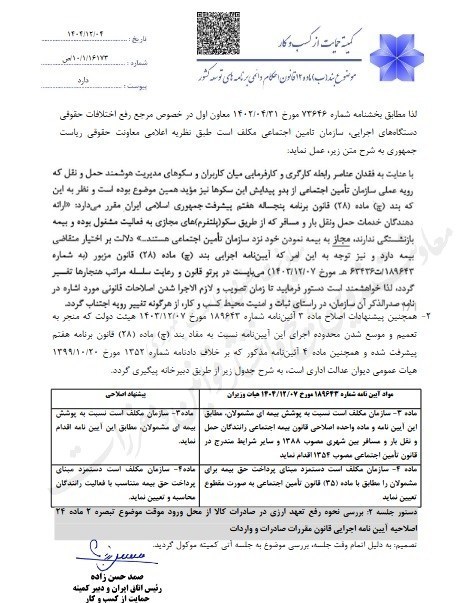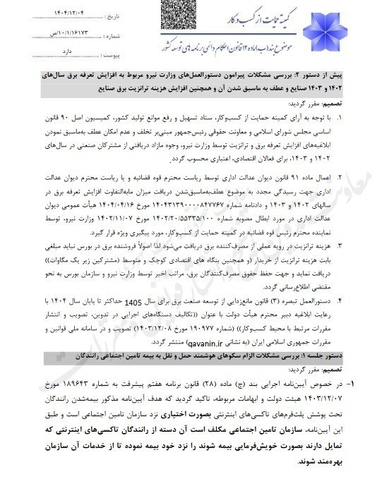 در بخش دیگری از این جلسه و در حوزه محیط کسبوکار، پیگیری اتخاذ تدابیر ویژه برای حمایت از فعالان اقتصادی آسیبدیده از حادثه بندر شهید رجایی در دستور کار قرار گرفت. با توجه به نزدیک شدن به پایان مهلت تعلیق رفع تعهدات ارزی در تاریخ 1404.12.29، مقرر شد نشستی در بانک مرکزی با حضور نمایندگان معاونت حقوقی ریاست جمهوری، بانک مرکزی، سازمان توسعه تجارت، سازمان بنادر و دریانوردی، استانداری هرمزگان و اتاق ایران برگزار و نتایج آن در جلسه آتی کمیته ارائه شود.